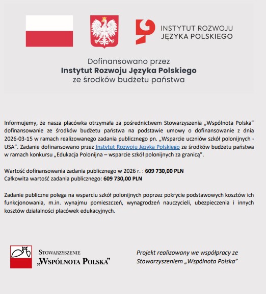 Dziękujemy Wspólnocie Polskiej za przyznane dofinansowanie w wysokości 132 000,00 zł, które umożliwi nam realizację naszych planów edukacyjnych.